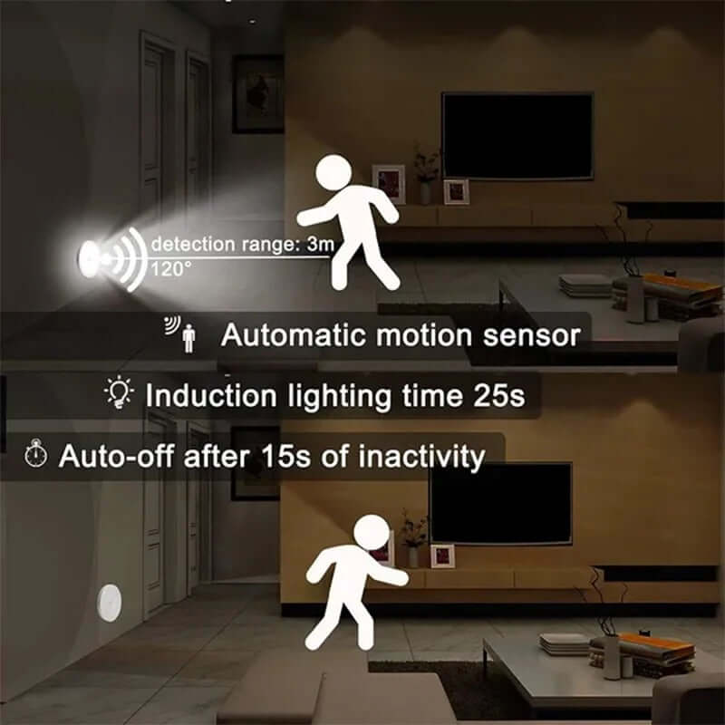 - What's Included: 1x PIR Motion Sensor LED Night Light, 1x USB charging cable, 1x adhesive mount